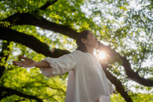 2025-10-08自律養生之言與行 <自律養生之言與行之1040> A woman is closing her eyes and outstretching her arms under trees in nature. 所有的聚焦回到「身體天賦」,進化已為我們預設了這套程式,那是真正的財富,也是引領我們遠離病痛的真正實力。