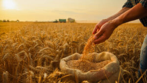 Male hands gather ripe wheat grains into a burlap sack, with harvesting machines in the distant field under a warm sunset sky.