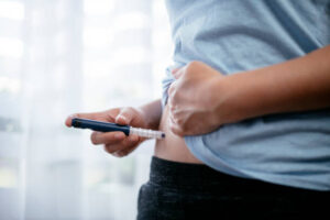 Woman is making insulin injection in the stomach. Stock photo Shadow DOF. Developed from RAW; retouched with special care and attention; Small amount of grain added for best final impression. 16 bit Adobe RGB color profile.
