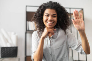 Friendly adorable African American female office worker businesswoman freelancer with Afro hairstyle joyfully waving, smiling and saying hi, making hello sign, greeting and welcoming a newcomer