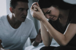 Angry Husband Yells at Wife During Quarrel. Crying Woman Holds Head with Hands Has Conflict with Man at Home. Couple Sitting on Bed and Arguing. Family Relationship Problems and Misunderstanding